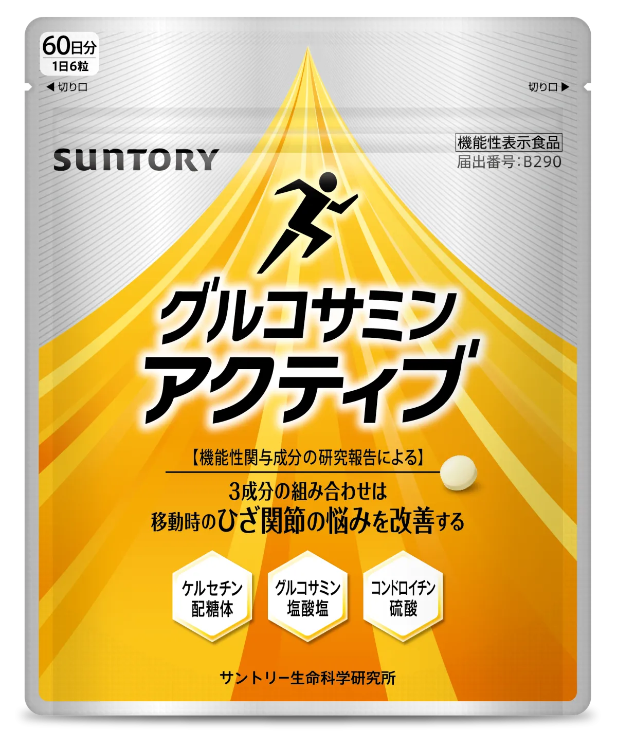 この「グルコサミンアクティブ」は、主にひざの健康を維持することを目的としたサプリメントです。具体的には、グルコサミン塩酸塩、コンドロイチン硫酸、そしてケルセチン配糖体の3つの成分を配合した機能性表示食品です。サントリーの研究に基づき開発されたこの組み合わせは、20年以上にわたる脚の研究から誕生したものであり、特許も取得しています。このことが、製品の信頼性を証明しています。