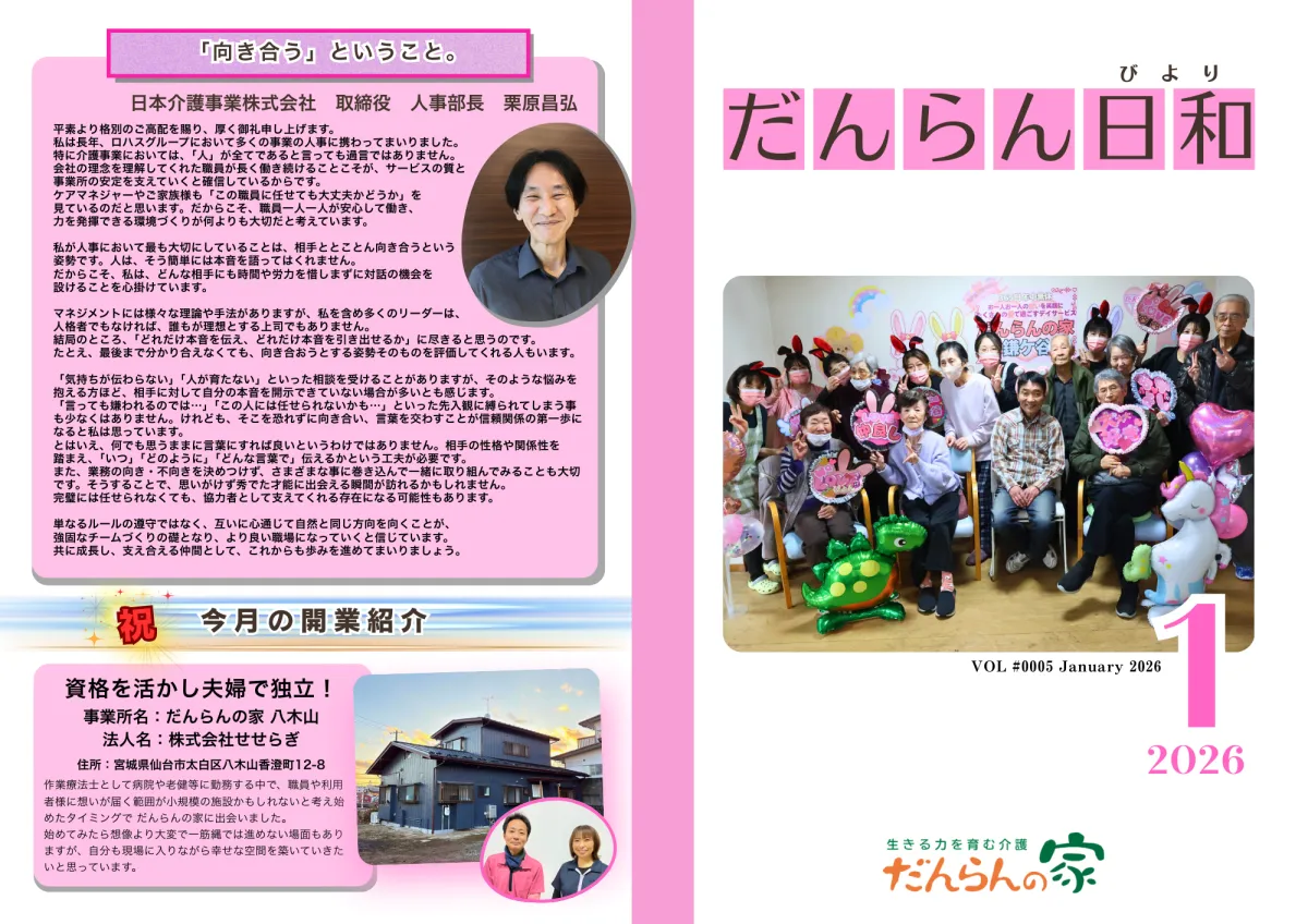 月刊広報誌『だんらん日和』では、全国の「だんらんの家」での活動を紹介しています。直接の経営者やスタッフの声を届けることで、利用者様やその家族とのつながりを深める目的があります。本誌の制作には、障がいを抱えるスタッフも参加しており、多様性を尊重したチーム作りが行われています。