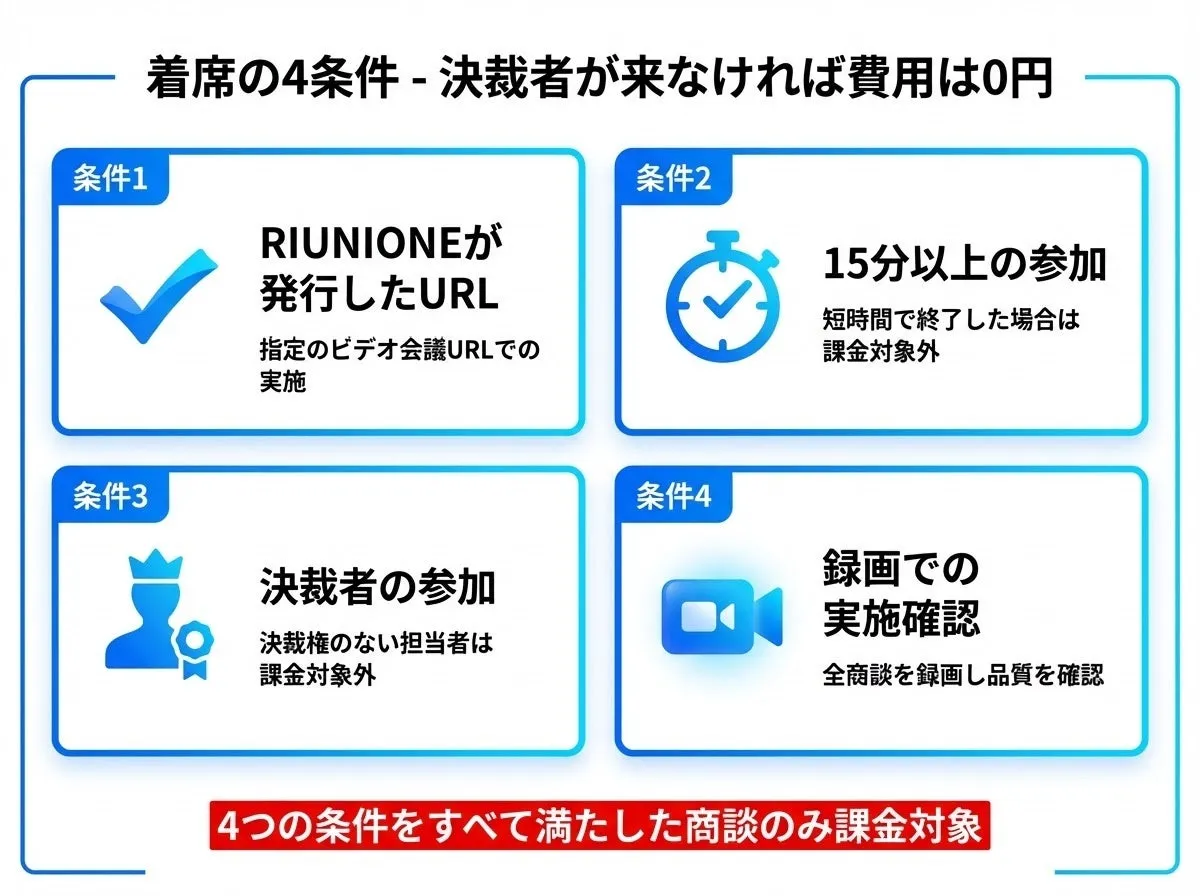 厳格な着席条件:参加条件は明確で、RIUNIONEが発行したURLを利用した商談、15分以上の参加、決裁者の参加、商談の録画確認が必要です。