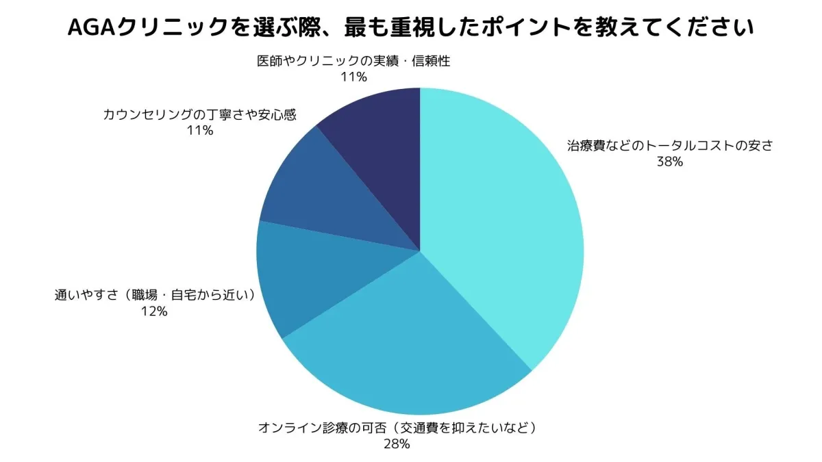 2025年8月に実施されたこの調査では、回答者の多くが「費用の総額」と「オンライン診療の可能性」に重点を置いていることがわかりました。AGA治療は長期的なものであるため、初期費用だけでなく、治療を受け続ける上でのトータルコストが重要です。意見として「治療の最初は不安があった」との声があり、治療期間とそれに伴う費用に明確さを求める傾向が強いことも伺えます。