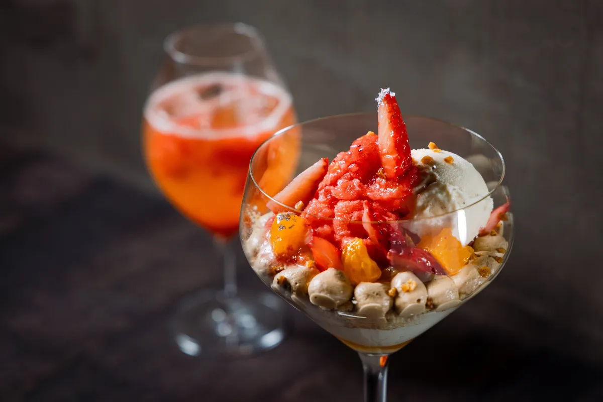 この店では、定番の「イチゴの花畑パフェ」や季節ごとの限定パフェも取り扱っており、旬の素材を最大限に活かしたメニューを展開しています。パフェとペアリングカクテルのほか、贅沢な空間でのひとときを楽しむことができます。