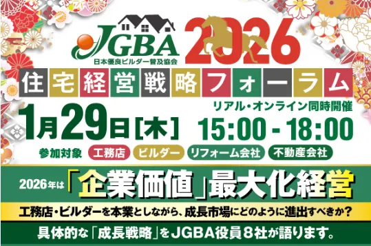 一般社団法人日本優良ビルダー普及協会(JGBA)は、2026年1月29日(木)に「住宅経営戦略フォーラム」を開催します。本フォーラムは、工務店やビルダー、リフォーム会社や不動産会社など、様々な住宅業界の企業が集まり、情報を共有し、ネットワークを広げる絶好の機会となります。