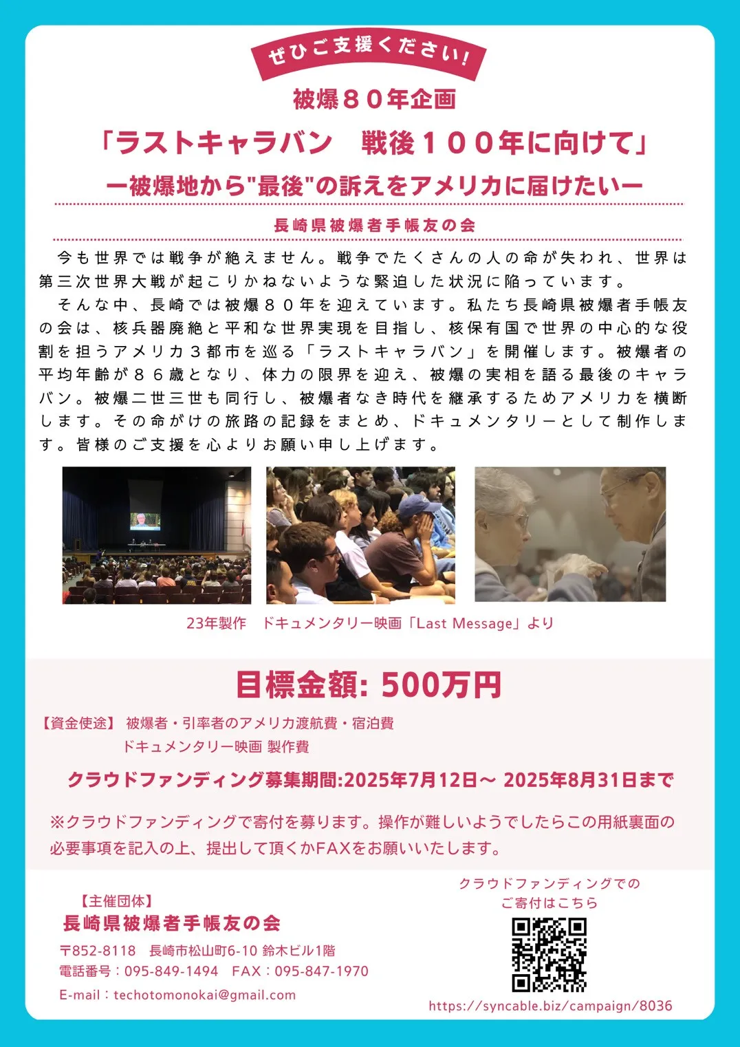 プロジェクトの資金は、クラウドファンディングによって支援を募ります。目標金額は500万円。これにより、渡航費や宿泊費、撮影機材費など、キャラバンの活動費が賄われます。支援が集まることで、被爆者の貴重な経験とメッセージが、未来へと繋がっていきます。