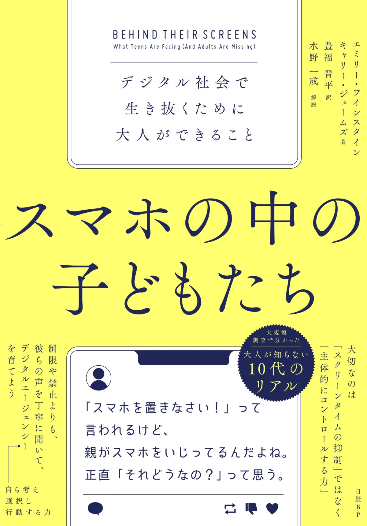 エミリー・ワインスタインは、デジタル社会の中での若者の生活に関する幅広い研究を行い、10年以上の経験を持つ社会科学者です。彼女の研究は、現代のテクノロジーが思春期の若者に及ぼす影響に焦点を当てています。キャリー・ジェームズもまたハーバードで社会科学の研究を行い、若者のデジタル経験に関する知見を深めています。そして訳者の豊福晋平は、教育情報化に関する専門家であり、デジタルシティズンシップ教育の普及に尽力してきた実績があります。