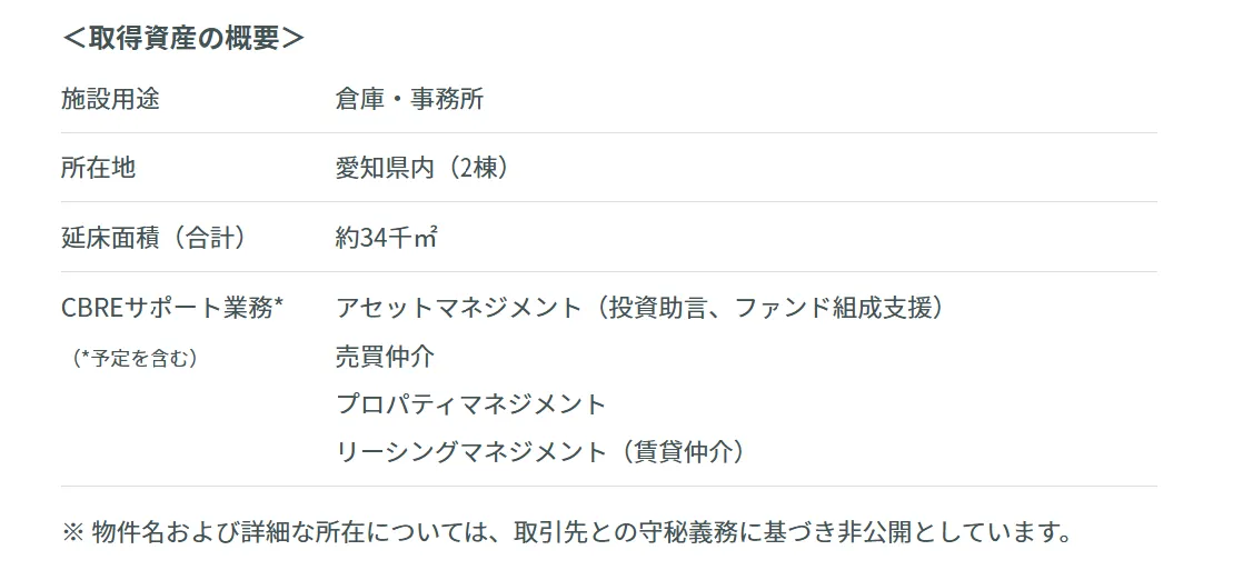 シービーアールイー株式会社(以下、CBRE)は、このたび愛知県内にある物流施設2棟を対象とした私募ファンドの設立と、これによる資産の取得を支援することを発表しました。本ファンドは、中部圏の持続的な物流施設の需要を受けて、地元の複数の投資者が参加する形で構成されています。この取組みの最大の特徴は、地元投資家が自らの地域経済を支える优良な物流資産に投資できる機会を提供することです。