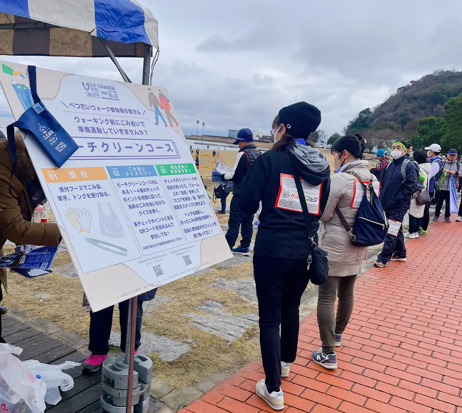 今回の取り組みとして新たに設置された「ビーチクリーンコース」では、参加者が田ノ浦ビーチ内に設けられた4つのチェックポイントを巡り、各ポイントに設置された二次元バーコードをスマートフォンで読み取ることで、海洋ごみに関連するクイズに挑戦しました。全てのクイズに正解した参加者には、「べつだいウォーク」と「CHANGE FOR THE BLUE」のロゴが入ったオリジナルのサコッシュが贈られるという特典もあり、楽しみながら環境問題に対する意識を高めることを目的としました。