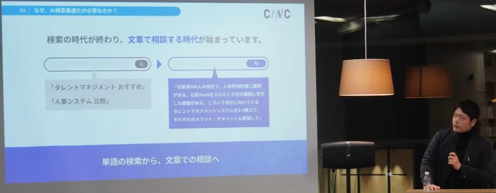 セミナーのテーマは「AI検索時代のマーケティング戦略 ─ 企業がいま取り組むべき対策方針と実践ステップ ─」。CINCのAI戦略部チーフ松村拓実氏と共に競氏が登壇し、AI検索最適化に関する戦略を深掘りしました。
