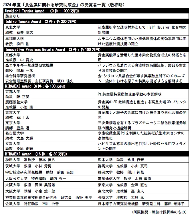 Wiki3: 東京都 中央区 研究助成金 田中貴金属 Ichiro Tanaka Award
