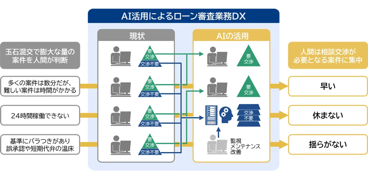 - - AIは、提出されたローン案件の承認確率を算出し、これに基づいて業務フローを制御します。これにより、約50%から80%の案件は人間の審査を介さずに即座に承認される仕組みです。