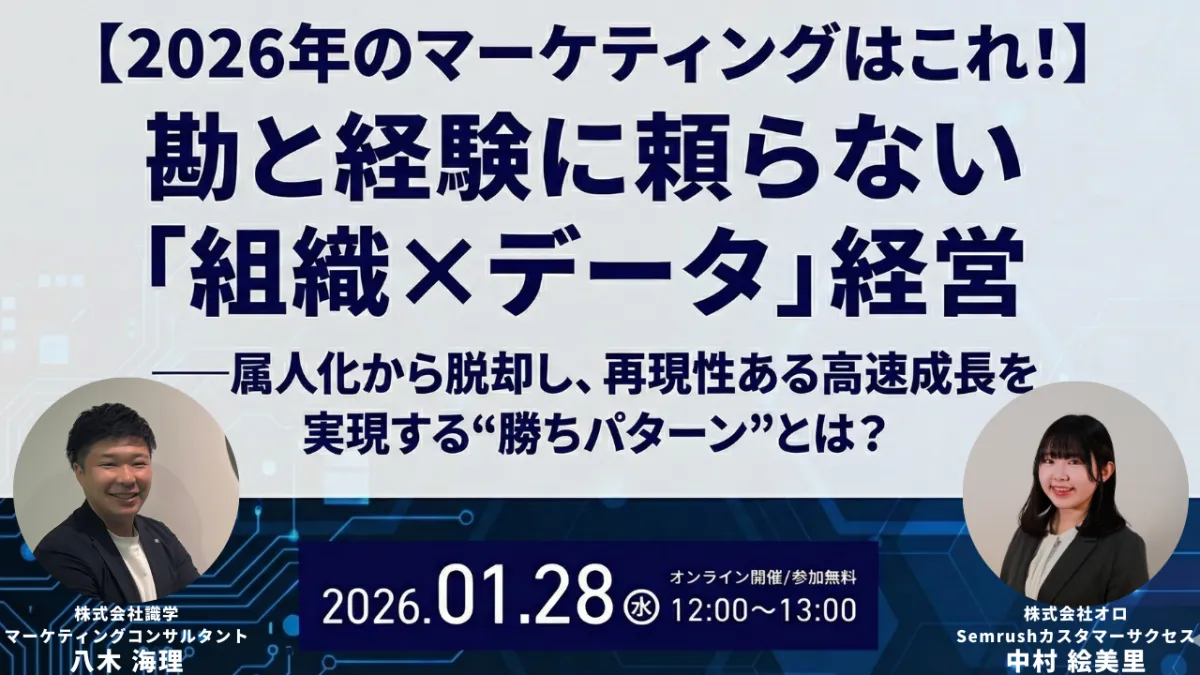 株式会社オロと株式会社識学が共催する、2026年1月28日(水)に開催される無料ウェビナー、「組織×データ」マーケティング戦略セミナーをご紹介します。このセミナーは、現在の広告費高騰を背景に、広告運用から脱却してSEOやコンテンツマーケティングに特化した持続可能な集客戦略を構築するための内容となっています。