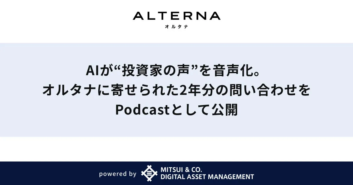 三井物産デジタル・アセットマネジメント(以下、当社)は、その資産運用サービス「ALTERNA(オルタナ)」に寄せられた投資家からの質問をAI音声化し、音声コンテンツとして提供を開始しました。この取り組みは、過去2年間に受けた約90件の「商品」関連の問い合わせを元に構成されています。