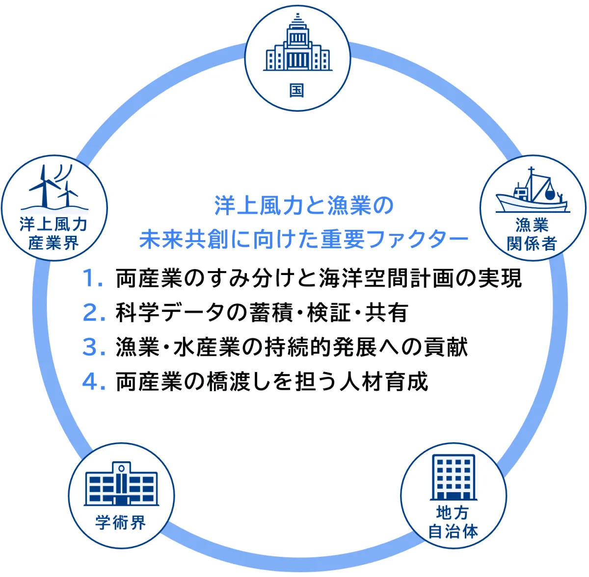 レポートでは、洋上風力と漁業の未来を共創するための11の提案をまとめています。それぞれの提案は、国や地方自治体、洋上風力産業、漁業界、有識者といった関係者がどのような役割を果たすべきかを考察しています。