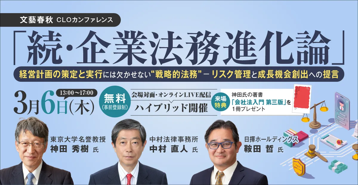 2025年3月6日、文藝春秋主催の「続・企業法務進化論」が開催されます。このカンファレンスでは、企業法務がどのように経営戦略に貢献できるのか、また、デジタル化の進展に伴うリスクと機会についての重要なディスカッションが行われます。
