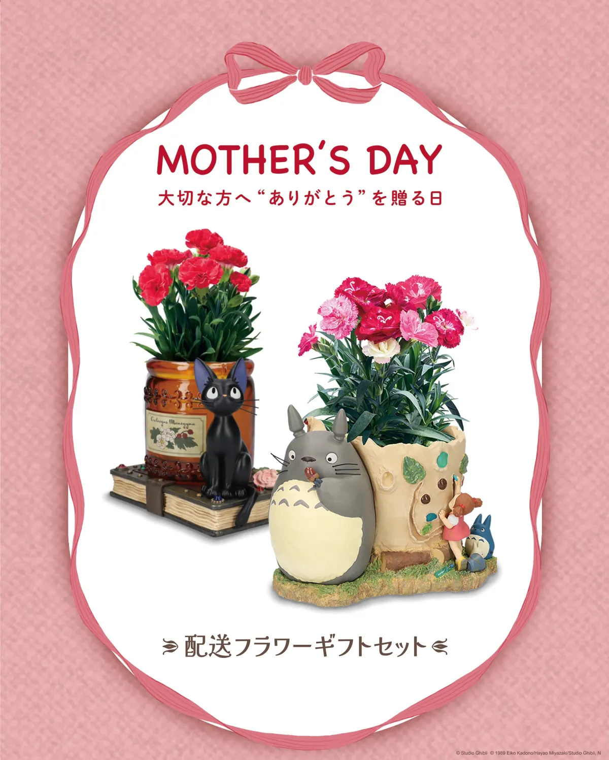 このフラワーギフトは、ジオラマボックスと美しい生花のカーネーションの組み合わせになっています。ジブリ作品を愛する方々にはもちろん、特別な“ありがとう”をお母さんに伝えたい方にもぴったりなアイテムです。