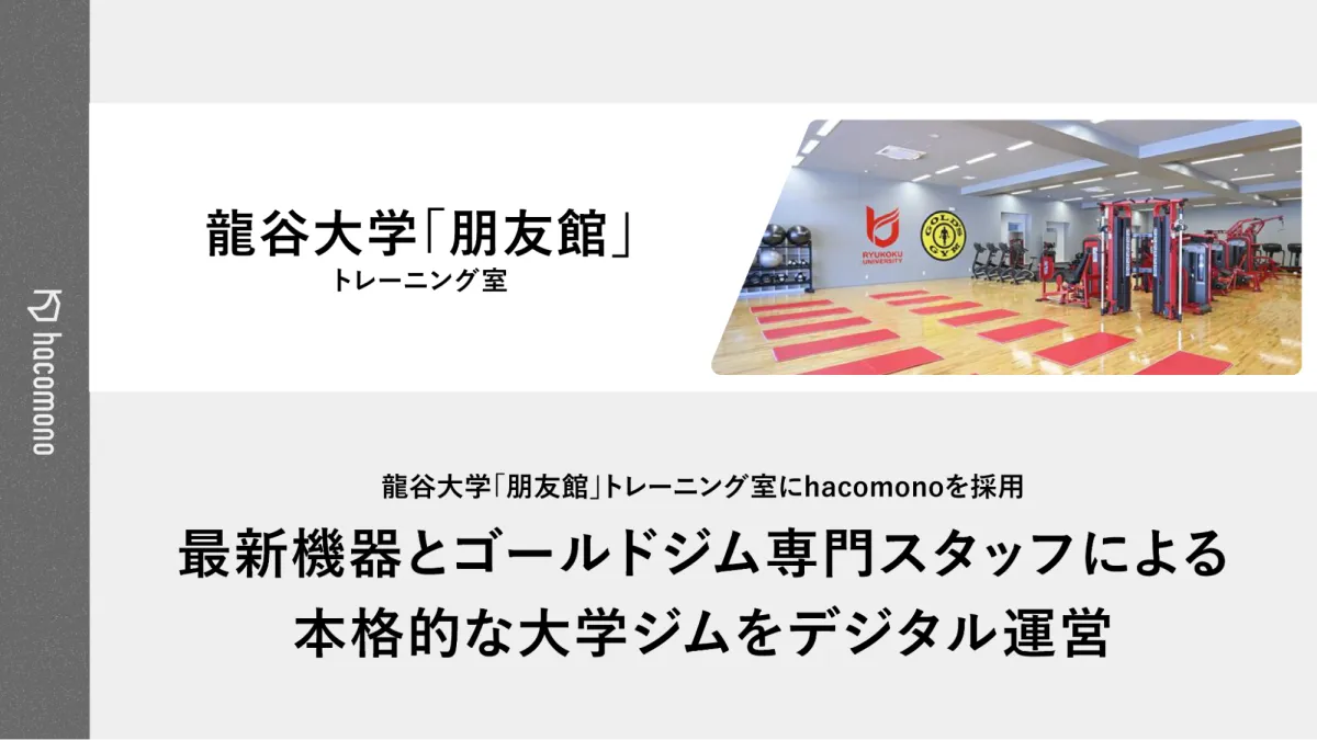 龍谷大学の課外活動拠点である「朋友館」内のトレーニング室に、株式会社hacomonoが提供するオールインワン・マネジメントシステムが導入されました。これにより、館内のトレーニング環境は一新し、大学の学生や教職員に向けた本格的なジム運営が実現します。
