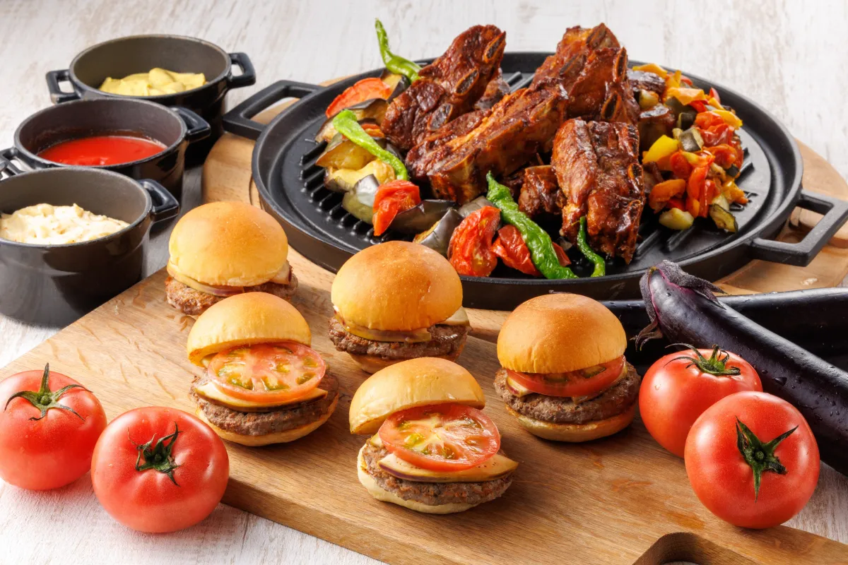 次に紹介するのは、日南トマトと県内産茄子のピクルスを使用したビーフバーガーです。このハンバーガーでは、ジューシーなビーフパティに地元産の夏野菜が絶妙に組み合わさっており、鳥取名産の「砂丘らっきょ」のマヨネーズソースが添えられています。日南トマトのフルーティーな風味が、全体の味をより一層引き立てています。