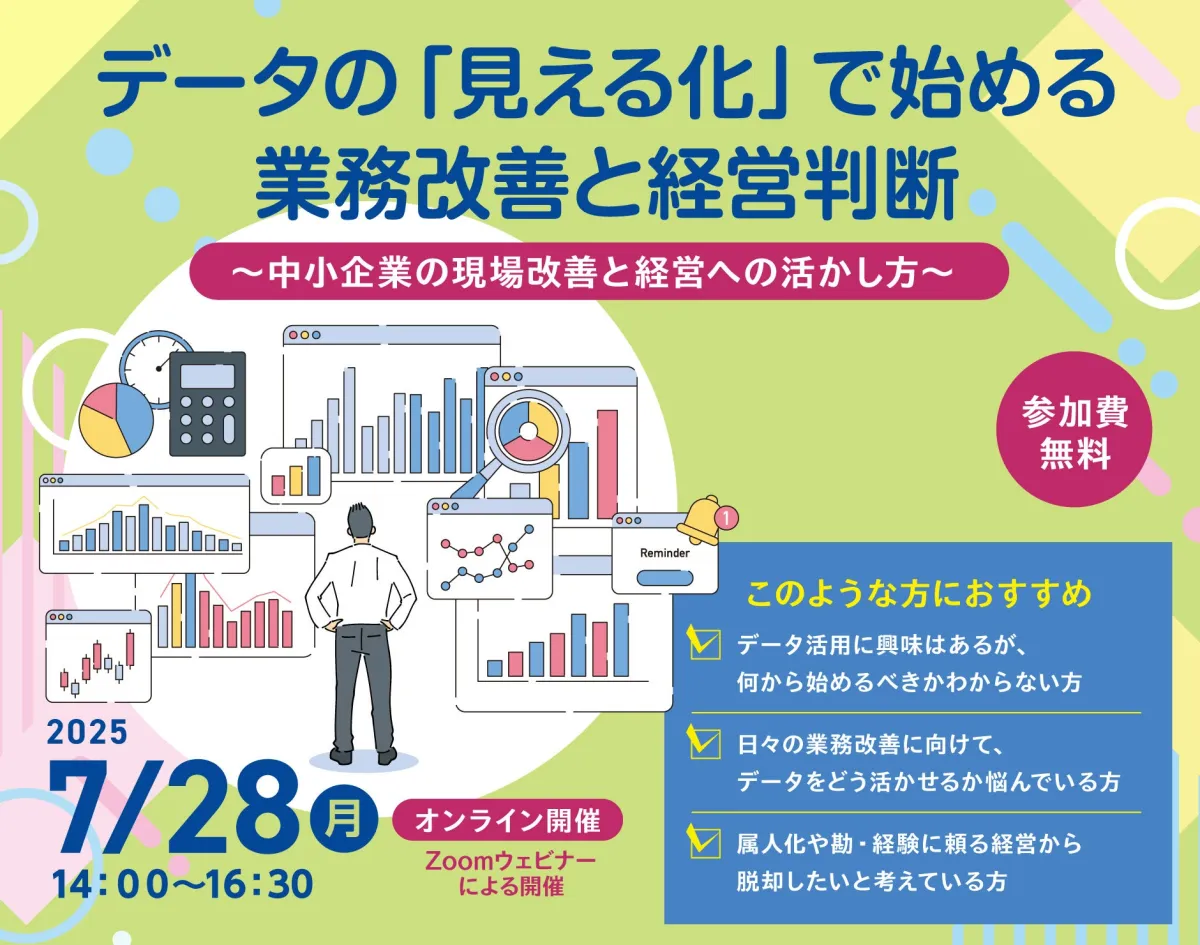 このウェビナーは、中小企業におけるデータ活用の第一歩を踏み出すための重要な機会となります。手間を減らし、業務の見える化を進めることで、営業利益や生産性の向上につなげるために、ぜひともご参加をお待ちしています!
