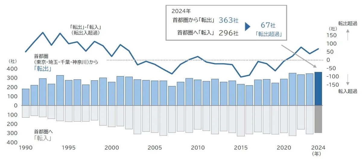 新たな経済構造が見えてきた2024年、首都圏から地方への本社移転の動きが加速しています。帝国データバンクが実施した調査によると、今年、首都圏から地方に本社を移した企業数は363社に達し、過去最多を更新しました。一方、地方から首都圏への転入は296社と減少傾向にあり、67社の転出超過という結果に。このトレンドが続く中、何が企業を地方へと駆り立てるのでしょうか。