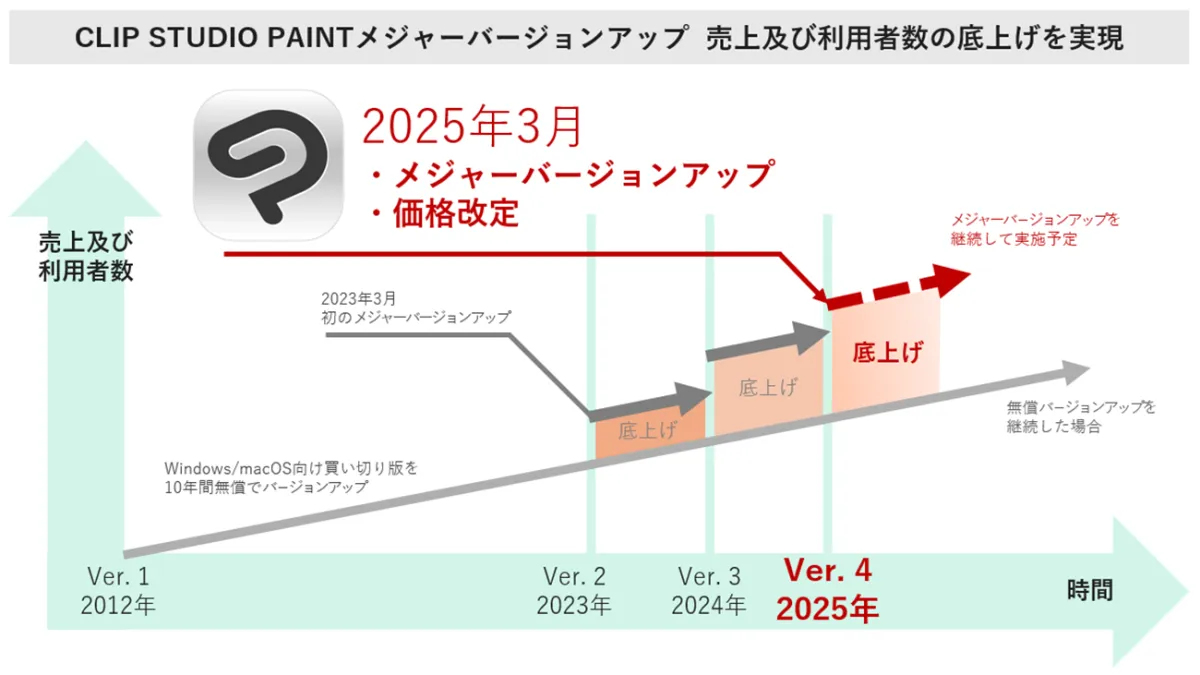 CLIP STUDIO PAINTは、2012年に初回がリリースされて以来、買い切り版として無償バージョンアップを続けてきた実績があります。最近の2023年および2024年の有償メジャーバージョンアップは、顧客から高く評価され、グローバルな販売促進キャンペーンの結果として出荷本数が大きく伸びました。これに伴い、売上や利用者の数も増加し、CLIP STUDIO PAINT Ver.4.0も同様の効果が見込まれています。