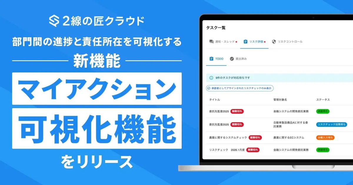 情報セキュリティの重要性が高まる中、リスク評価のプロセスには多くの課題が残されています。特に従来までのリスク評価では「どこで止まっているのかが分からない」という声が多く、悪影響を及ぼすことがありました。しかし、SecureNavi株式会社が新たに発表した「2線の匠クラウド」の新機能である「マイアクション可視化機能」により、この問題が一掃されることが期待されています。
