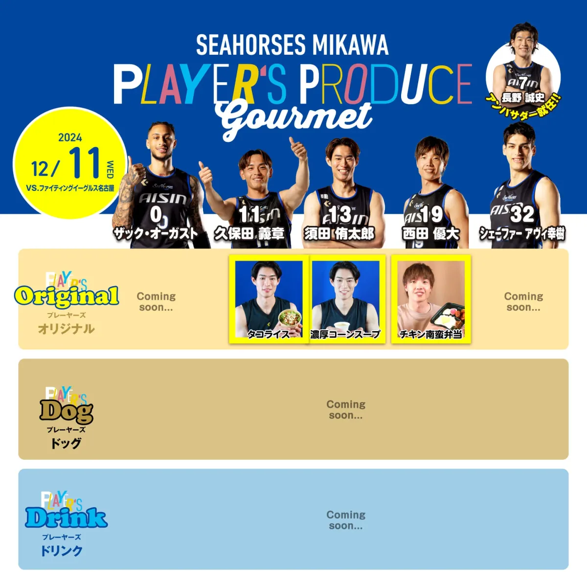 ファンの皆さん、いつもシーホース三河を応援していただきありがとうございます。12月11日(水)に行われるファイティングイーグルス名古屋との試合にて、選手たちが心を込めてプロデュースした特別なグルメが販売されます。試合観戦をしながら、選手たちオリジナルの味を楽しむことができる絶好のチャンスです!
