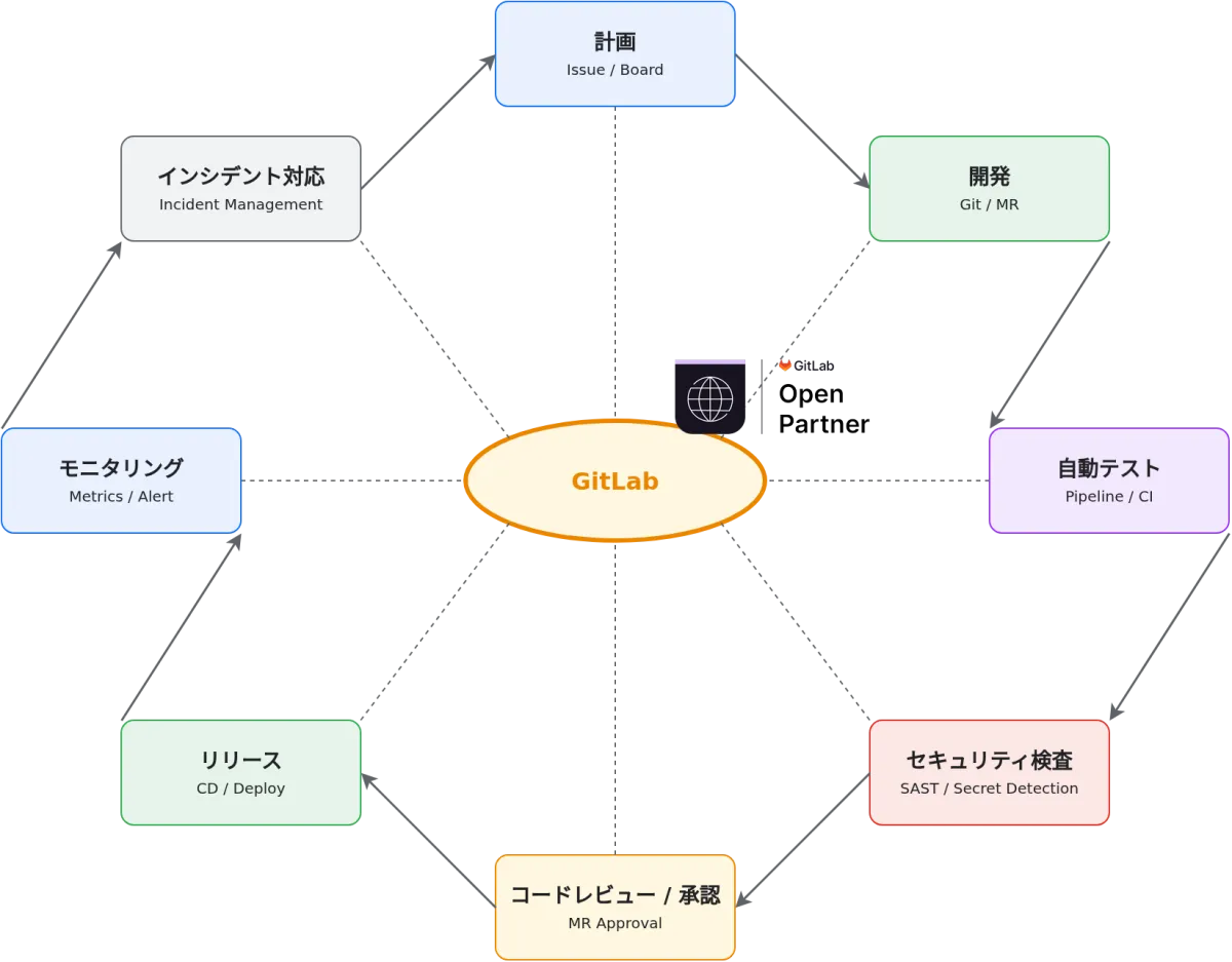 東京システムハウスはGitLab Open Partnerとして、GitLabを開発・運用の中核プラットフォームとして採用しています。これにより、開発から運用までを一つのプラットフォームで管理し、複数のツールを使う煩わしさを解消します。