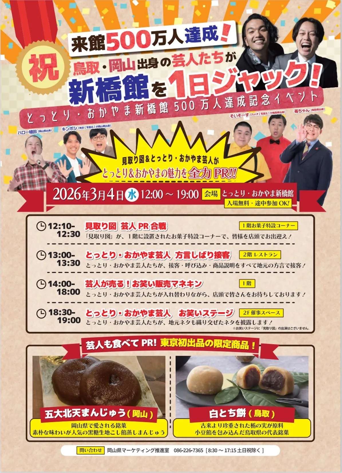 岡山県と鳥取県の魅力を発信するアンテナショップ「とっとり・おかやま新橋館」が、2026年2月13日に来館者数500万人を達成しました。この若干の節目を祝うため、3月4日に「来館500万人達成記念イベント」を開催します。このイベントは岡山と鳥取の文化、食、観光を一堂にお楽しみいただける特別な機会です。