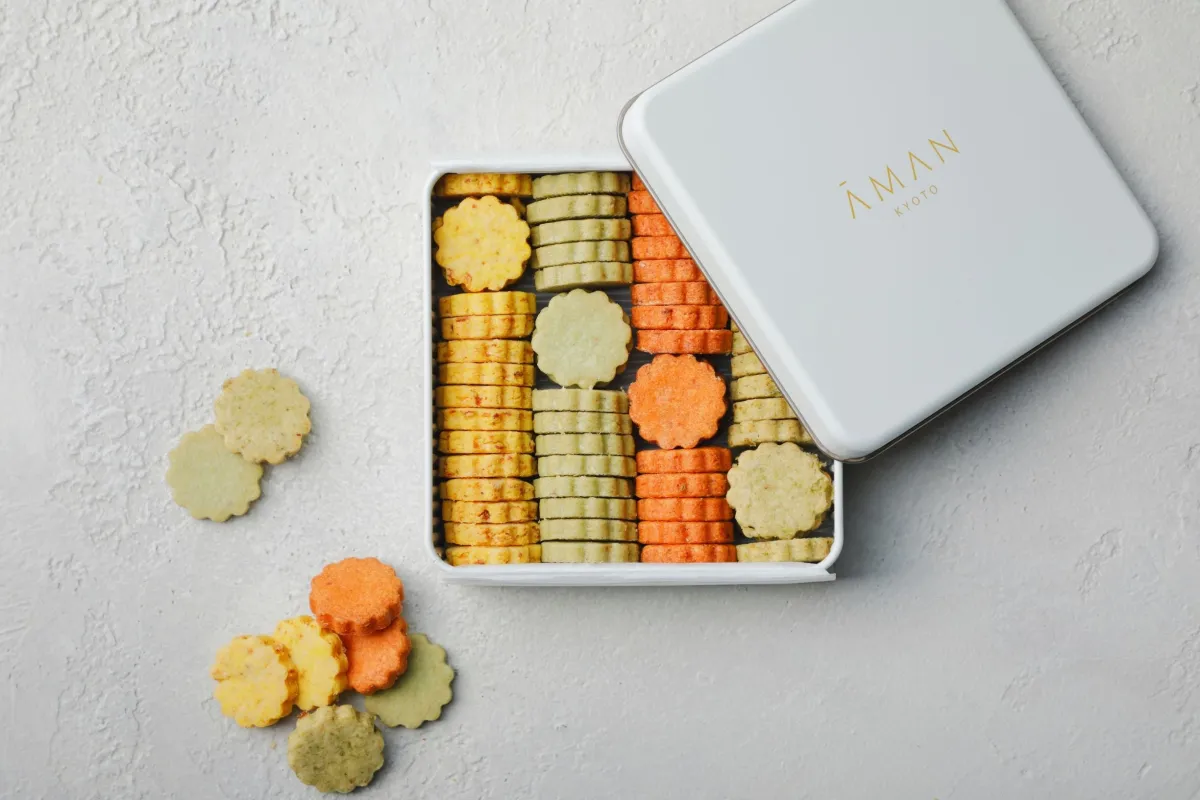 上賀茂の山間にある農家で採れた「上賀茂とうもろこし」、「上賀茂バジル」、「上賀茂トマト」、「賀茂ネギ」の4種の野菜を贅沢に使用。アマン京都のロゴをあしらった缶に、赤や黄、緑など、彩り豊かなサブレが68枚詰められています。
