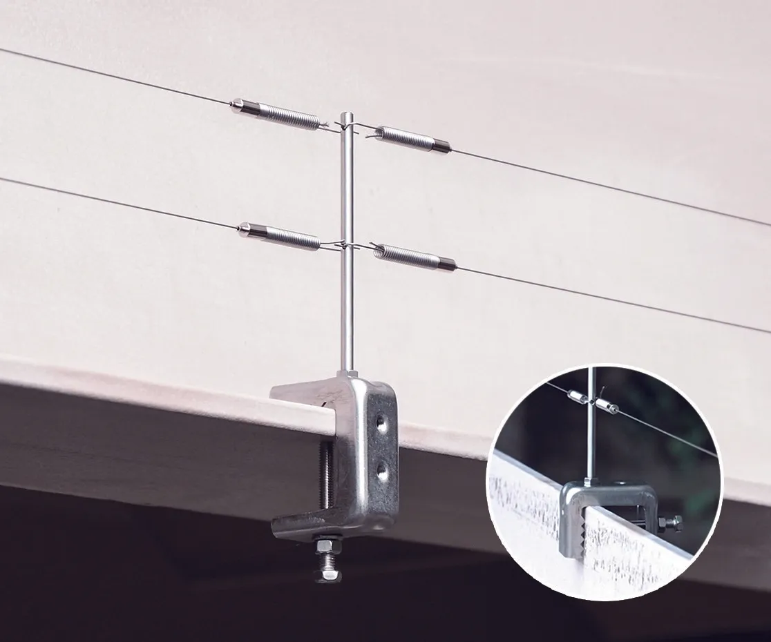 この「スマートクランプ支柱」は、鋼材にしっかりと固定され、2段のステンレスワイヤーを支えることで効果的に鳥の着地を防ぐ設計がされています。また、シンプルで目立たないデザインも高く評価されています。
