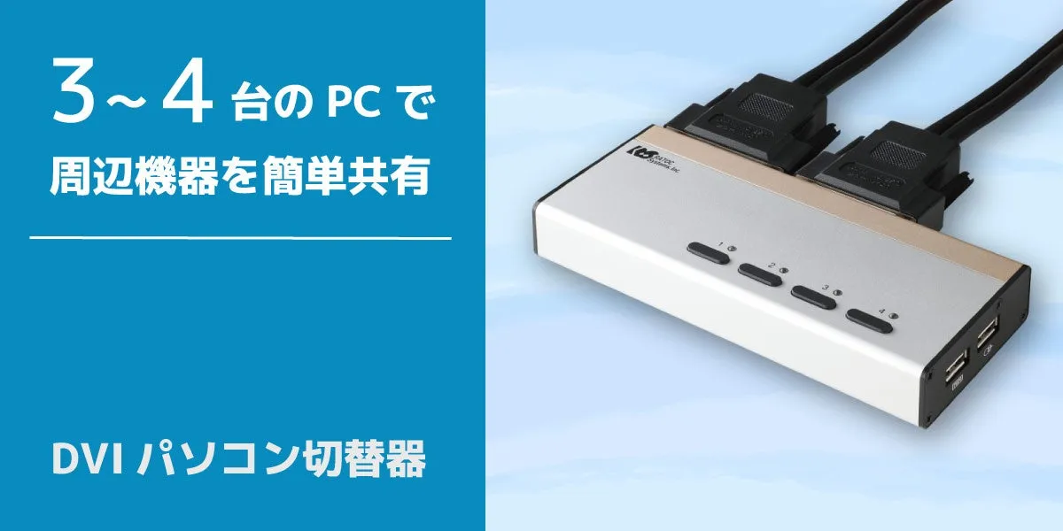「RS-430UDA」は、最大4台のパソコンを1組のキーボード、ディスプレイ、マウスで操作できる優れた切替器です。それぞれのパソコンに周辺機器を持つ必要がないため、大幅なデスクスペースの削減が可能です。また、同製品はフルHDおよびワイドディスプレイに対応しており、HDCPにも対応しています。さらに、電源を入れるだけで簡単に起動し、最適な解像度で表示されるのも魅力です。