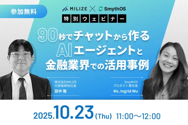 2025年10月23日(木)、株式会社MILIZEとSmythOSが共同で行う特別対談セミナー「AIエージェントと金融業界での活用事例」が開催されます。ウェビナーはオンライン形式で行われ、11:00から12:00までの間、充実した内容が提供される予定です。