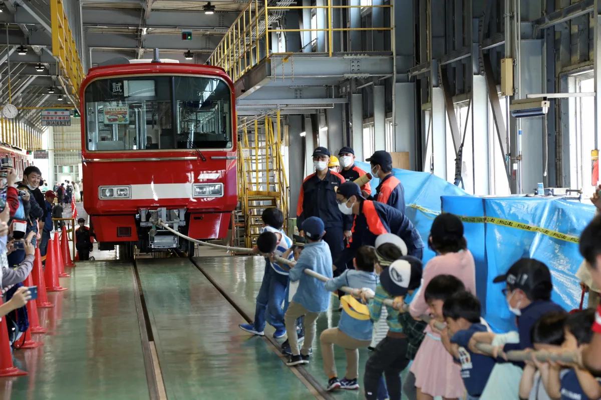 イベントでは、普段は立ち入ることができない舞木検査場内で、さまざまなプログラムを用意しています。特に注目すべきは、大型クレーンを使った『電車つり上げ作業の実演』や、参加者が電車と引き合う『でんしゃとつな引き』です。また、長年多くのファンに愛されてきた『7000系パノラマカー』などの静態保存車両も近くで見ることができます。