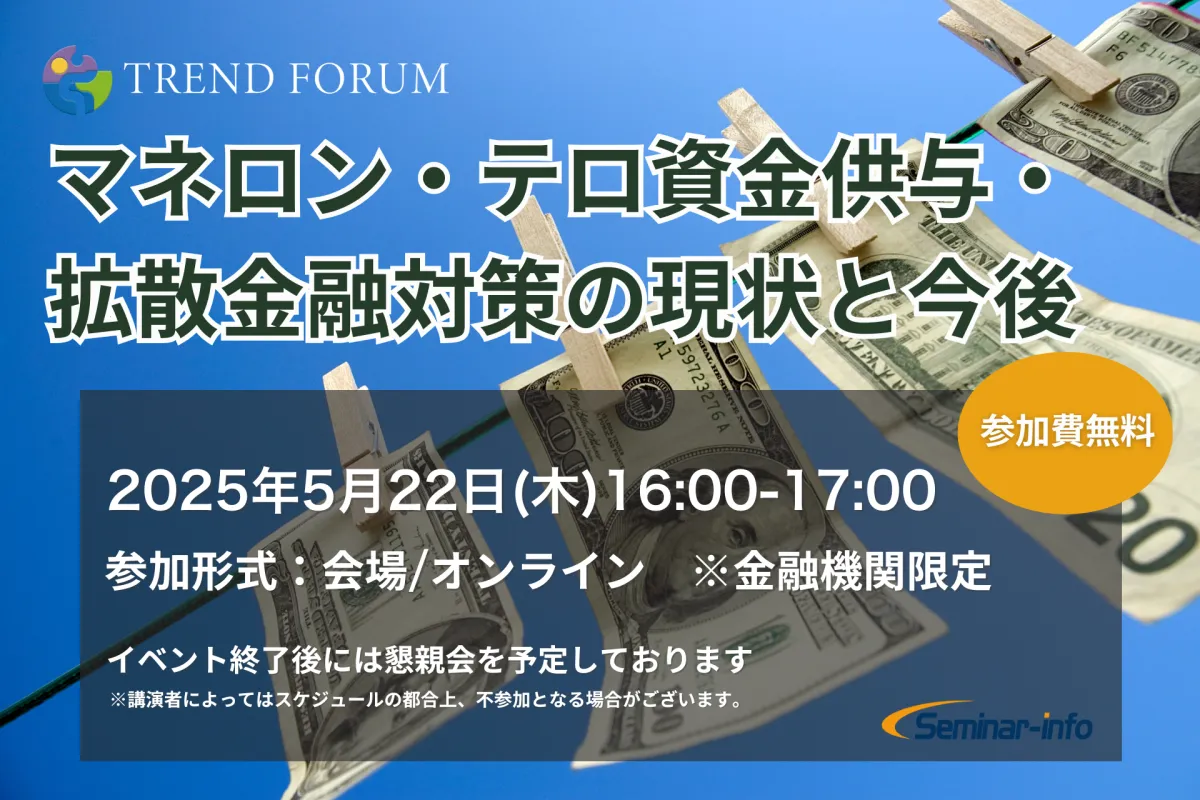 2025年5月22日(木)、株式会社セミナーインフォによるTREND FORUM「マネロン・テロ資金供与・拡散金融対策の現状と今後」が開催されます。このイベントでは、特に金融機関における効果的なマネロン対策に焦点が当てられ、参加者には充実した情報とディスカッションの場が提供される予定です。