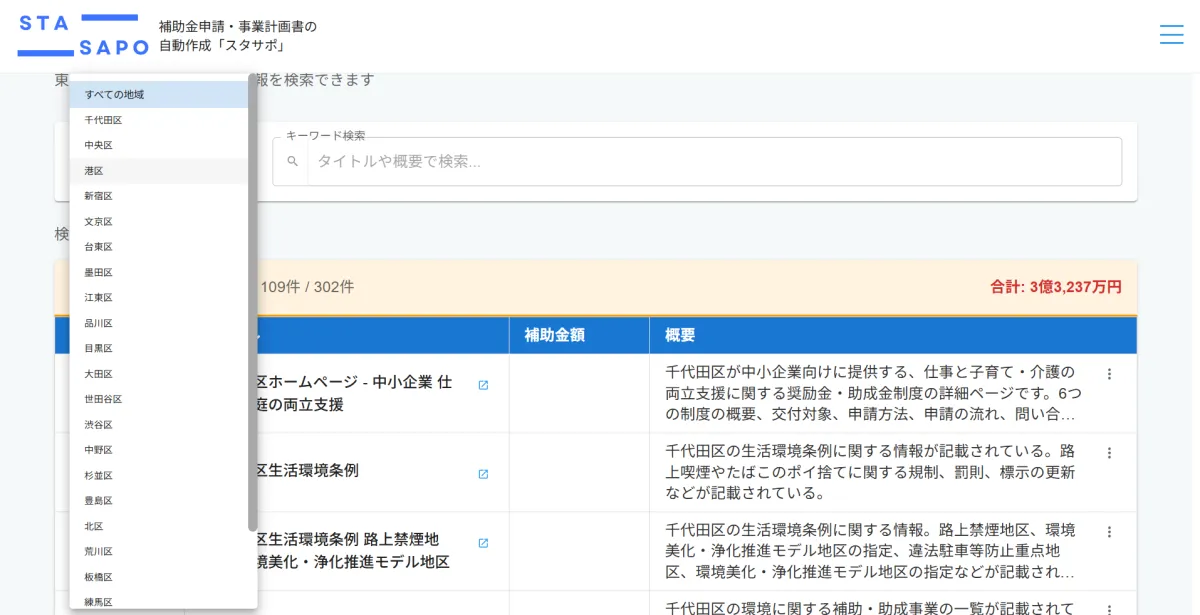 株式会社スタートアップサポーターが運営する補助金申請支援サービス「スタサポ」では、東京23区の自治体が実施する中小企業向けの支援情報を無料で公開しています。このページでは、各区の補助金情報や支援額、対象経費を簡単に参照できるため、中小企業経営者にとって大変便利なリソースとなることでしょう。