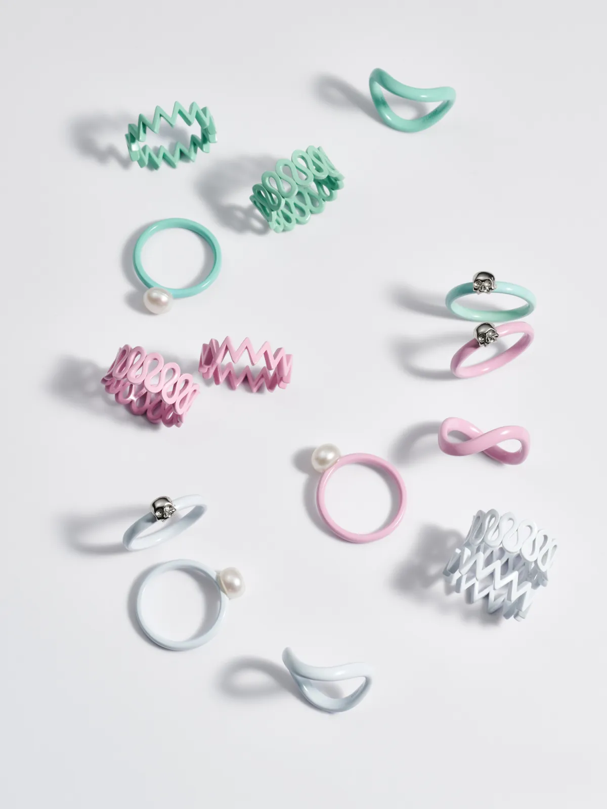 LAMBDAの“GENTLE GLOW”シリーズは、シルバー925を基本にした素材に、フレッシュで女性らしいペールトーンの色合いを取り入れています。このコレクションでは、リズミカルなラインが特徴的なデザインが施され、ミルキーな艶感が魅力的です。特に、これらのアイテムは重ねてコーディネートすることができ、自分だけのスタイルを演出する楽しさがあります。