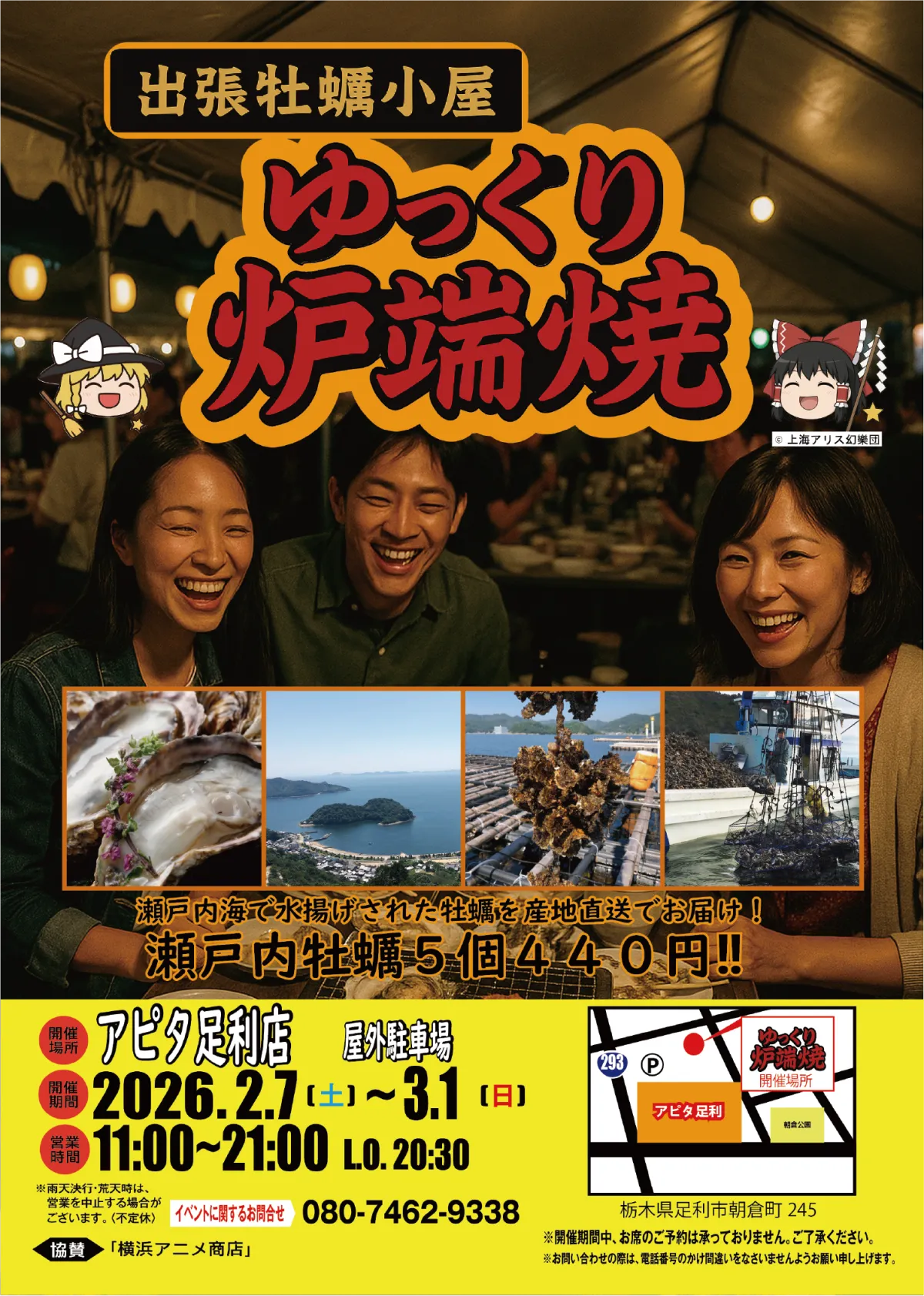 2026年2月7日から3月1日までの期間限定で、栃木県足利市のアピタ足利店の屋外駐車場に、エンタメ型出張牡蠣小屋「ゆっくり炉端焼き」がオープンします。このイベントでは、30種類以上の海鮮BBQメニューが用意されており、家族や友人と一緒に楽しむことができます。特に、瀬戸内や赤穂、石巻といった地域から直送された新鮮な牡蠣が自慢です。