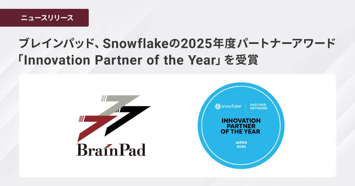 株式会社ブレインパッドが、Snowflake合同会社より「Innovation Partner of the Year」を受賞しました。この賞は、Snowflake AIデータクラウドの利活用を通じて革新的なソリューションを提供したパートナー企業に与えられるもので、今年度の受賞企業は全パートナーの中からわずか4社のみです。