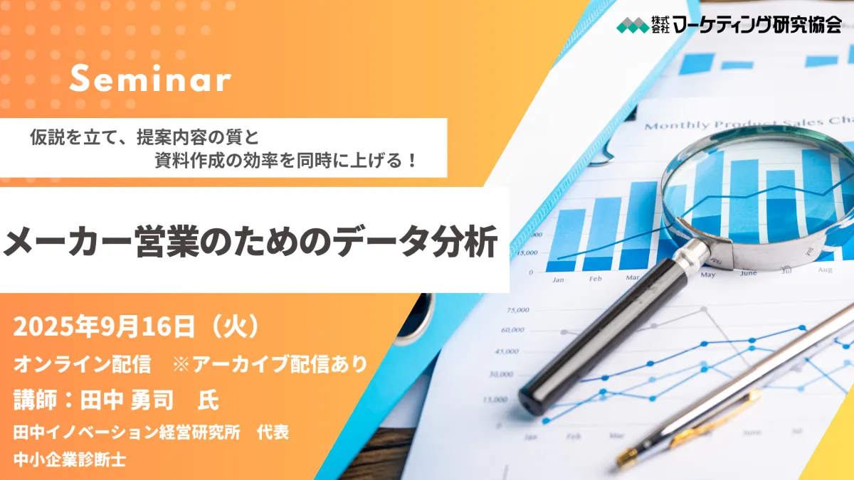 2025年9月16日、株式会社マーケティング研究協会が主催するオンラインセミナーが開催されます。本セミナーは、特に食品業界の営業担当者やマーケティング専門家の方々に向けて、実践的なデータ分析技術を学ぶ絶好の機会です。講師には、大手食品メーカーでの豊富な経験を持つ田中勇司氏を迎え、データ分析の基本から応用までを多角的に学ぶことができます。