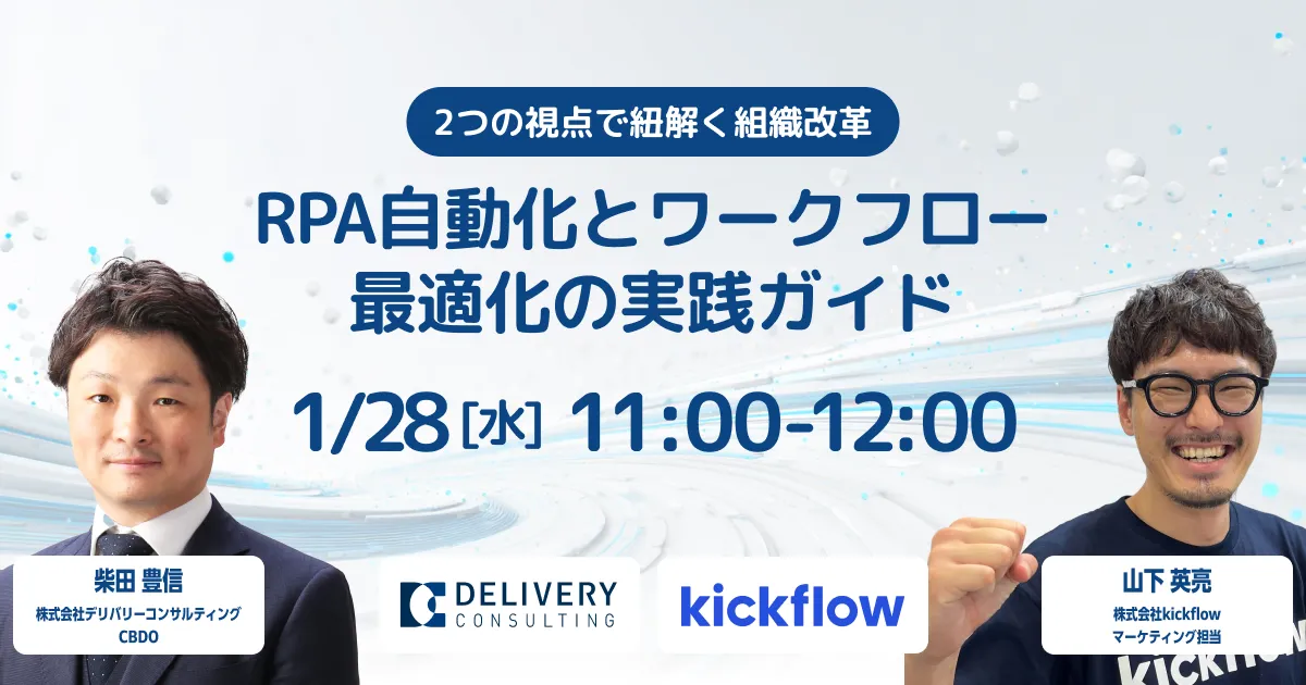 企業が持続的に成長するためには、バックオフィス業務の効率化が不可欠です。2026年1月28日(水)11:00から12:00に、株式会社デリバリーコンサルティングと株式会社kickflowが共催するウェビナー「2つの視点で紐解く組織改革 - RPA自動化とワークフロー最適化の実践ガイド」がオンラインで開催されます。