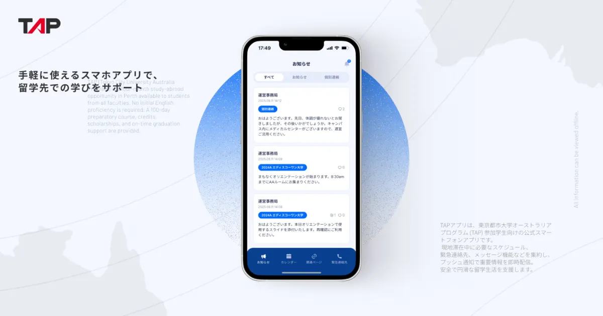 「TAPアプリ」は既に今年の2月と8月に留学を果たした約360名の学生に利用されており、留学に関する情報をスムーズに取得できるプラットフォームとして機能しています。大学のオーストラリア留学プログラムは、1年生から始まる準備教育と2年生の約4ヶ月間の留学を組み合わせた2年間の学習プランを提供しています。
