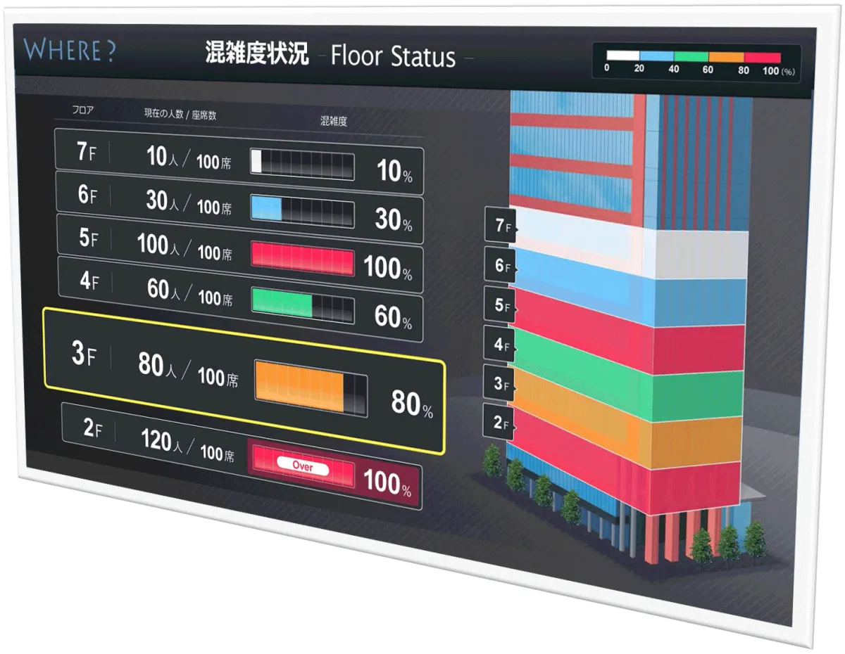 2. フロアごとの混雑度をリアルタイムで表示し、人が少ない場所を容易に把握。