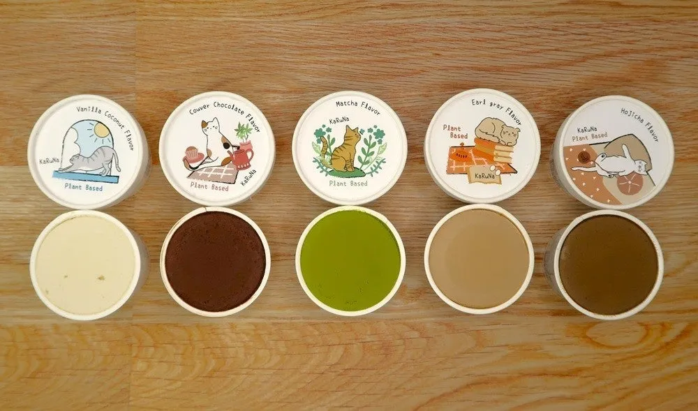 「ヴィーガンクラフトにゃんこアイス」は5つのフレーバーが揃っている。定番のバニラ、リッチなクーベルチョコレート、和のテイストを感じる抹茶、香ばしいほうじ茶、華やかなアールグレイの味わいが楽しめる。これらはどれもが心地よい後味を残し、さまざまなシーンで活躍するスイーツとなるだろう。