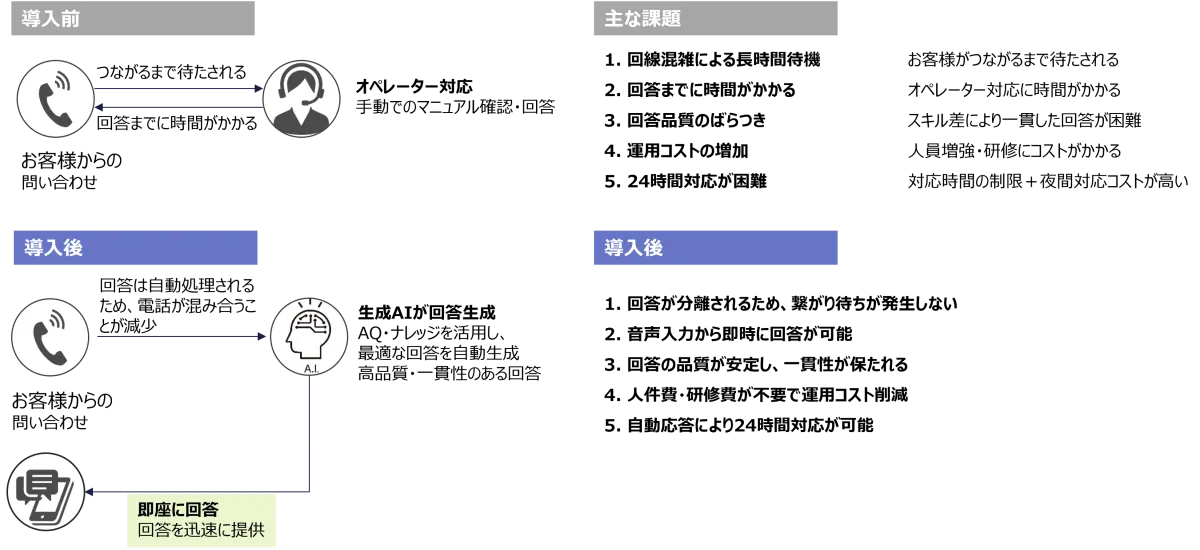 最近、コールセンターや店舗での電話対応は採用難や人手不足という深刻な課題に直面しています。特に「営業時間」や「よくある質問」など、定型的な問い合わせが多く、その対応には膨大な時間がかかることが多いです。さらに、これらの業務は個別のオペレーターに依存しがちで、属人化しやすいのが悩みの種です。そこで、AIによって反復的な電話業務を代替する仕組みが求められています。