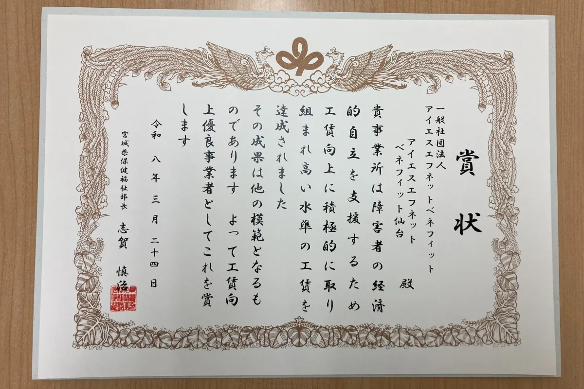 一般社団法人アイエスエフネットベネフィットの仙台事業所が、宮城県から「令和7年度工賃向上優良事業者表彰」を受け取ったことが、2026年3月24日に発表されました。この表彰は、宮城県が推進する「第五期宮城県工賃向上支援計画」で、特に優れた工賃向上実績を持つ事業者に贈られるものです。