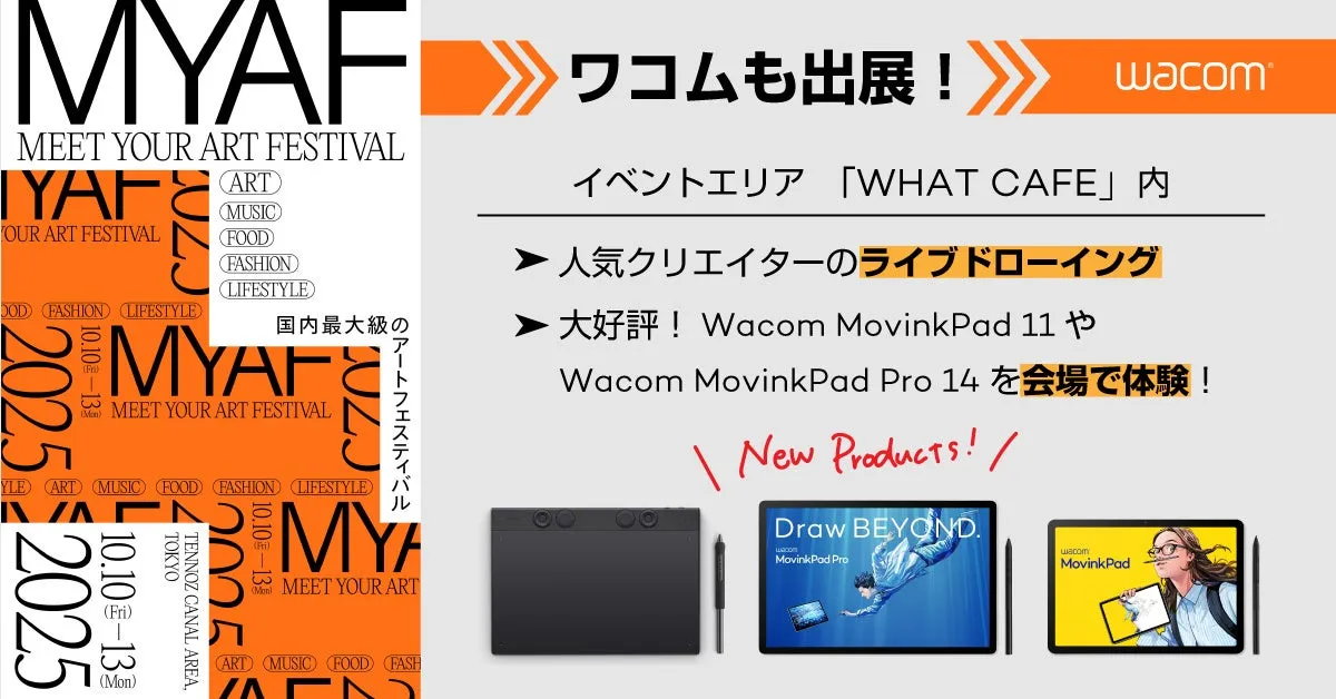 本イベントでは、WHAT CAFE内に設置されるワコムブースで、来場者は実際の製品を体験できるコーナーが設けられます。特に注目なのが、10月1日に発表されたばかりの「Wacom MovinkPad Pro 14」や、7月に発売された「Wacom MovinkPad 11」です。この両製品は、PCなしでどこでもスケッチ可能なオールインワンのポータブルクリエイティブパッドとして注目されています。