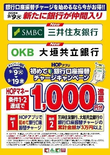 三井住友銀行と大垣共立銀行の加わったことを記念して、平和堂は「初めての銀行口座振替チャージキャンペーン」を実施します。このキャンペーンでは、初めて銀行口座振替チャージを利用する方に1,000円分のHOPマネーをプレゼントする特典が用意されています。