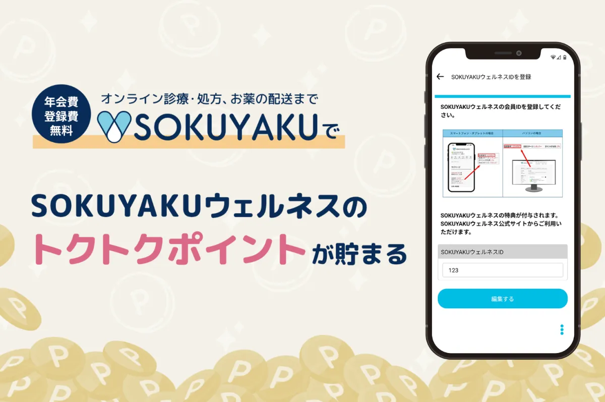 2025年4月28日より、SOKUYAKUユーザーはアプリ内でウェルネス会員番号を登録することで、オンライン診療や服薬指導の利用時に「トクトクポイント」を獲得できるようになります。この仕組みは、必要な時に診療を受け、その後の健康維持に役立つ製品を購入する際のサポートとなります。