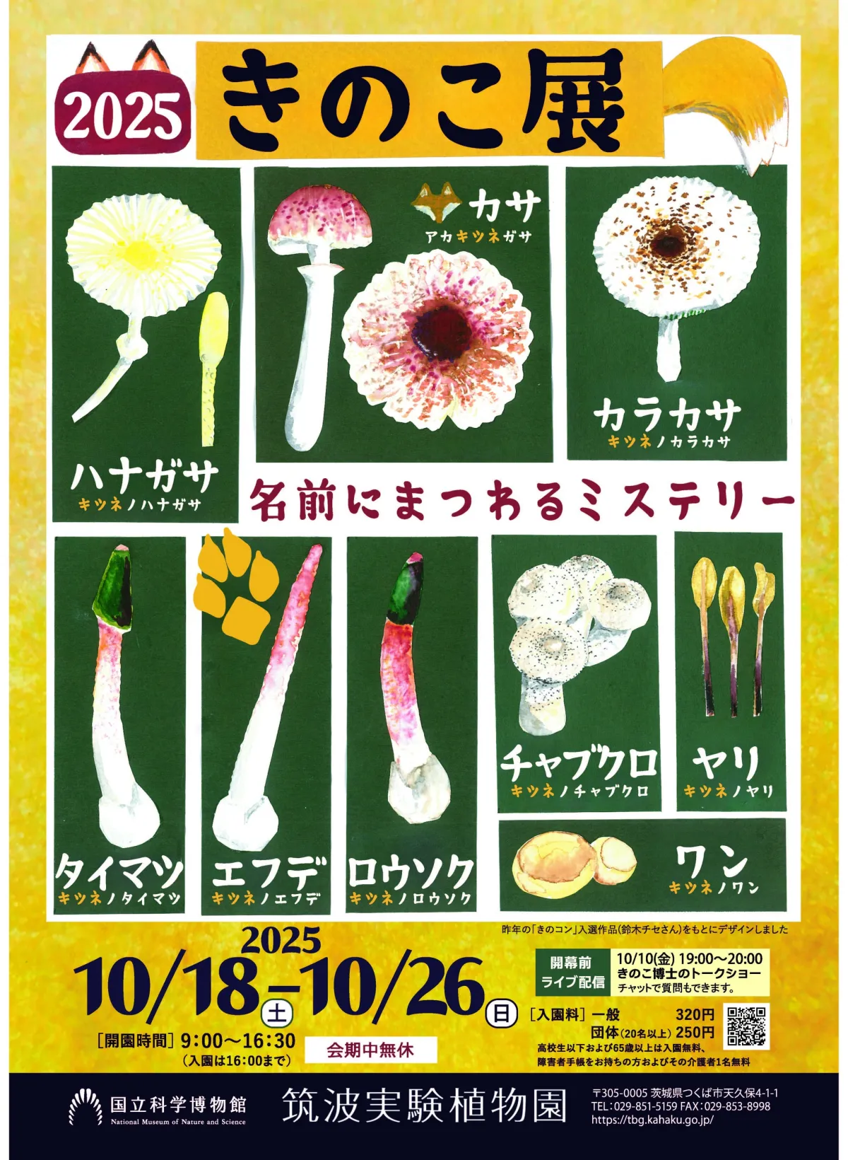 国立科学博物館 筑波実験植物園にて、2025年10月18日(土)から10月26日(日)まで、特別企画展「きのこ展 ~名前にまつわるミステリー~」が開催されます。本展では、きのこの名前にまつわる様々な謎を探求し、その背後にある文化や科学的視点を紹介します。