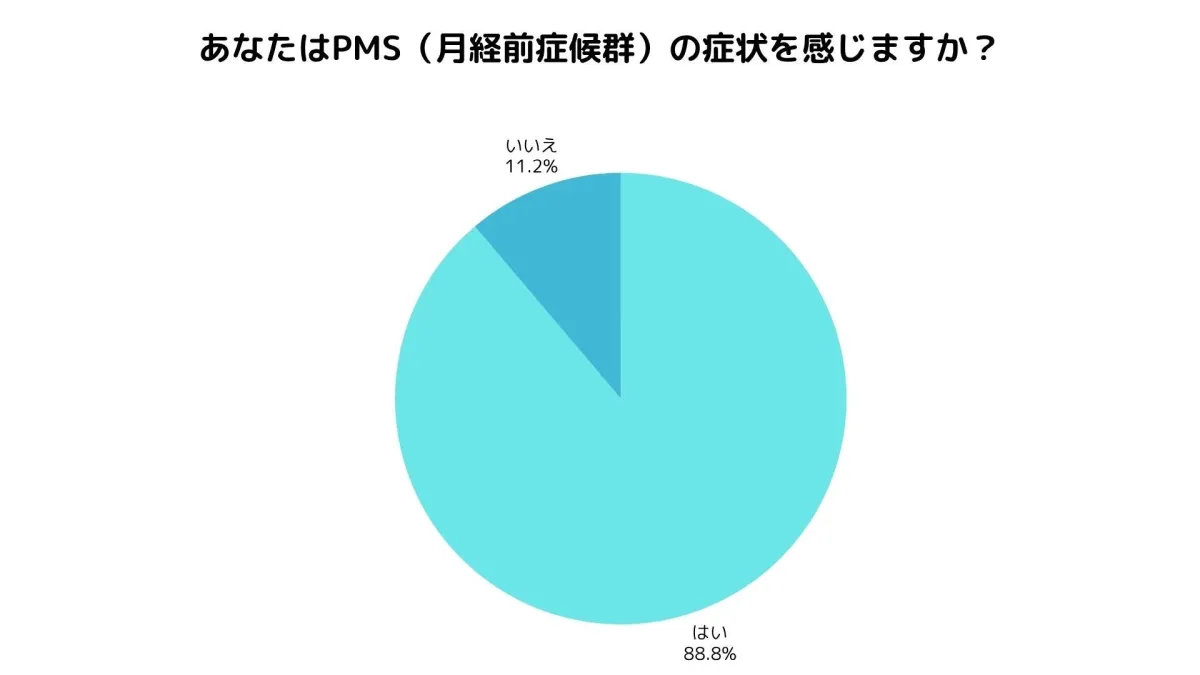 一般社団法人賢寿医療が運営するON-CLINICが実施した調査によると、20代から50代までの女性161名のうち、実に88.8%にあたる143名がPMS(月経前症候群)の症状を感じていると回答しました。この結果は、日常生活に大きな影響を及ぼしているPMSの実態を示しています。