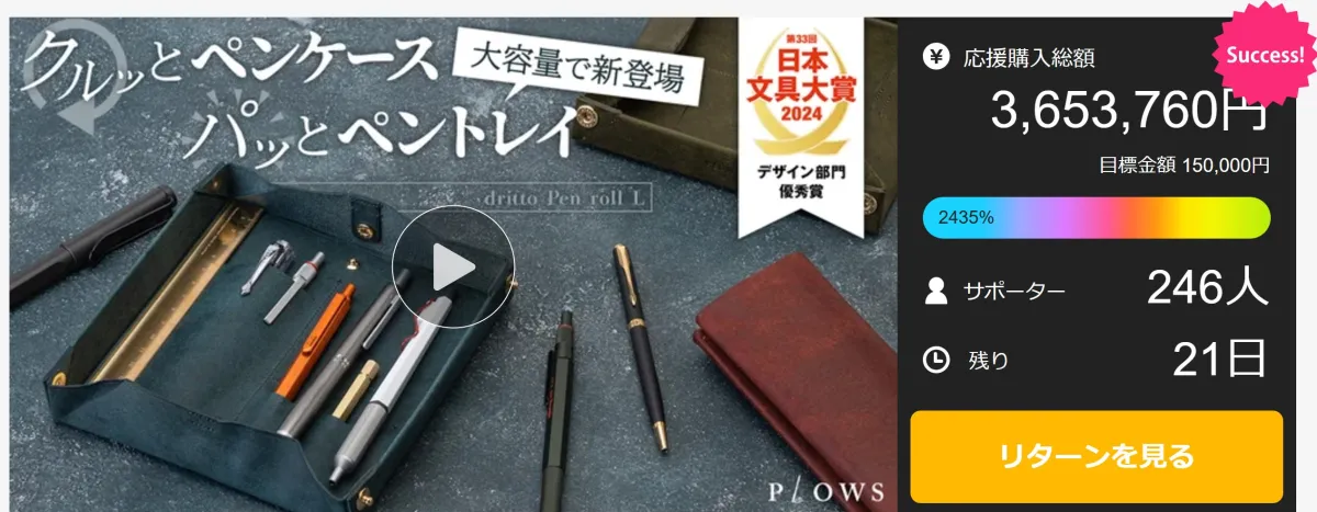 株式会社プラウズが手がける「dritto Pen roll L(ドリット ペン ロール エル)」がクラウドファンディングサイト・Makuakeで目標金額2435%を達成し、3,653,760円の支援を集めました。この製品は、日本文具大賞を受賞したペンケースの新たなバージョンとして展開され、特にそのユニークな機能性が注目を浴びています。